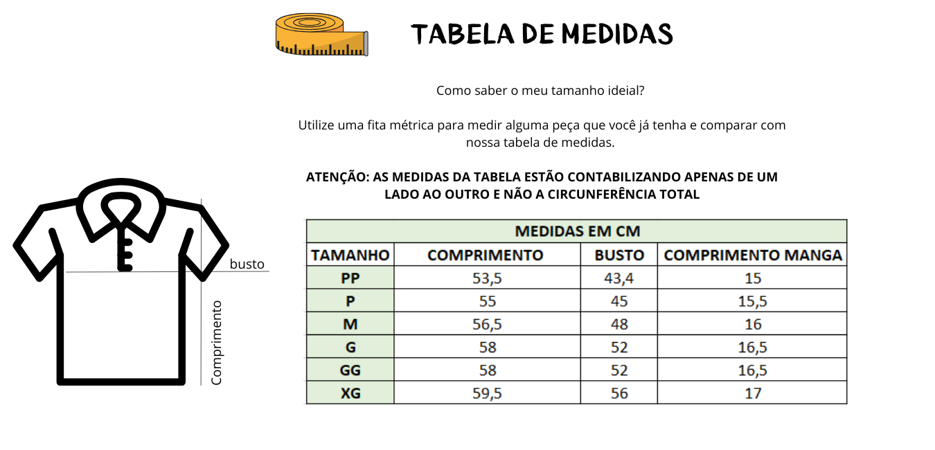 Para escolher o tamanho perfeito, Lembre-se que peças 100% algodão podem ter uma leve encolha após a lavação. Para saber sua medida perfeita, basta seguir as medidas da tabela abaixo: